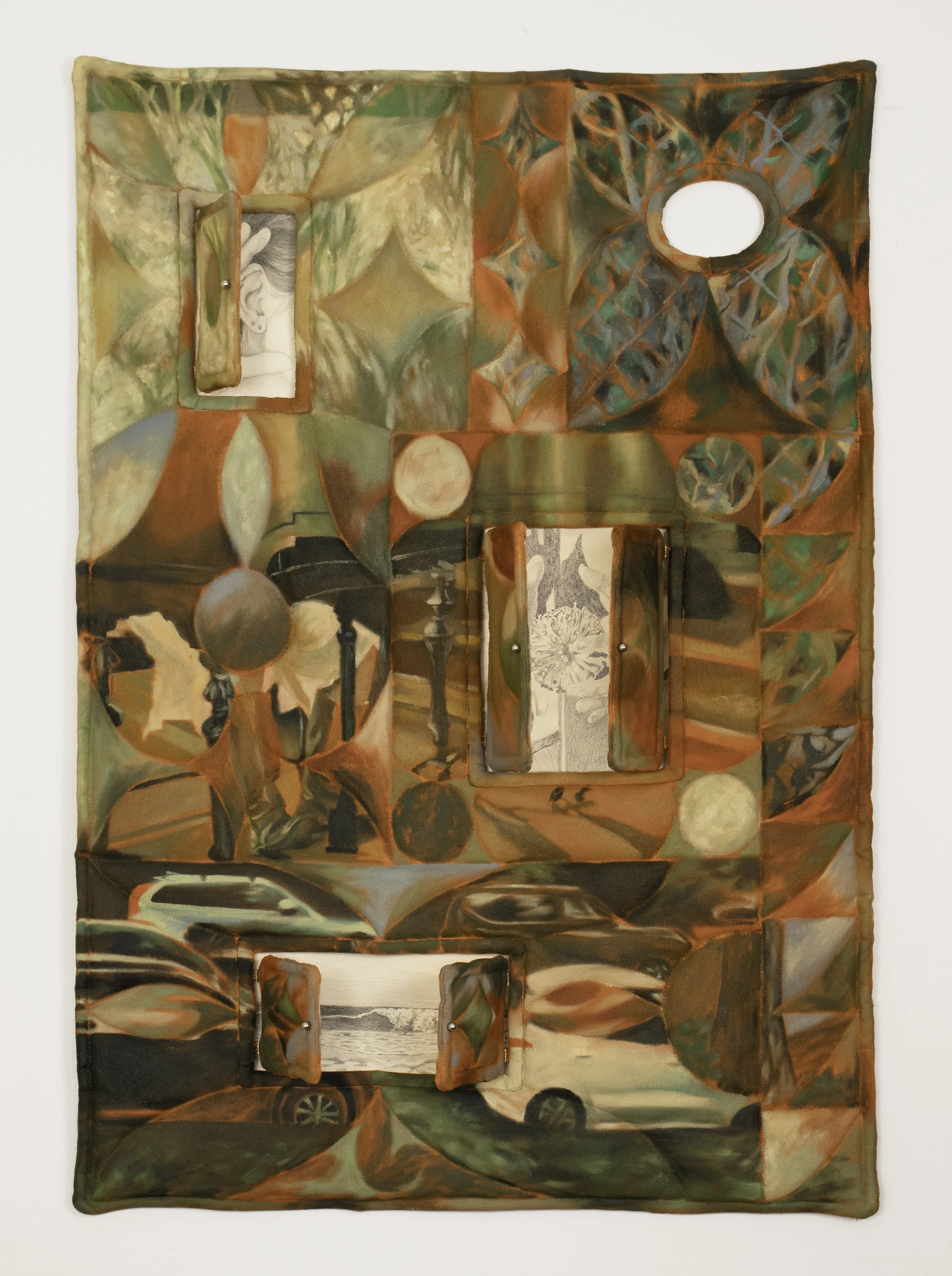Sydney Kleinrock, “Nothing’s happened, but I think it will soon,” Oil on quilted canvas, graphite, cotton paper, stainless steel, polystyrene, glue, 29 in x 20 in, 2025. Image courtesy of the artist.
